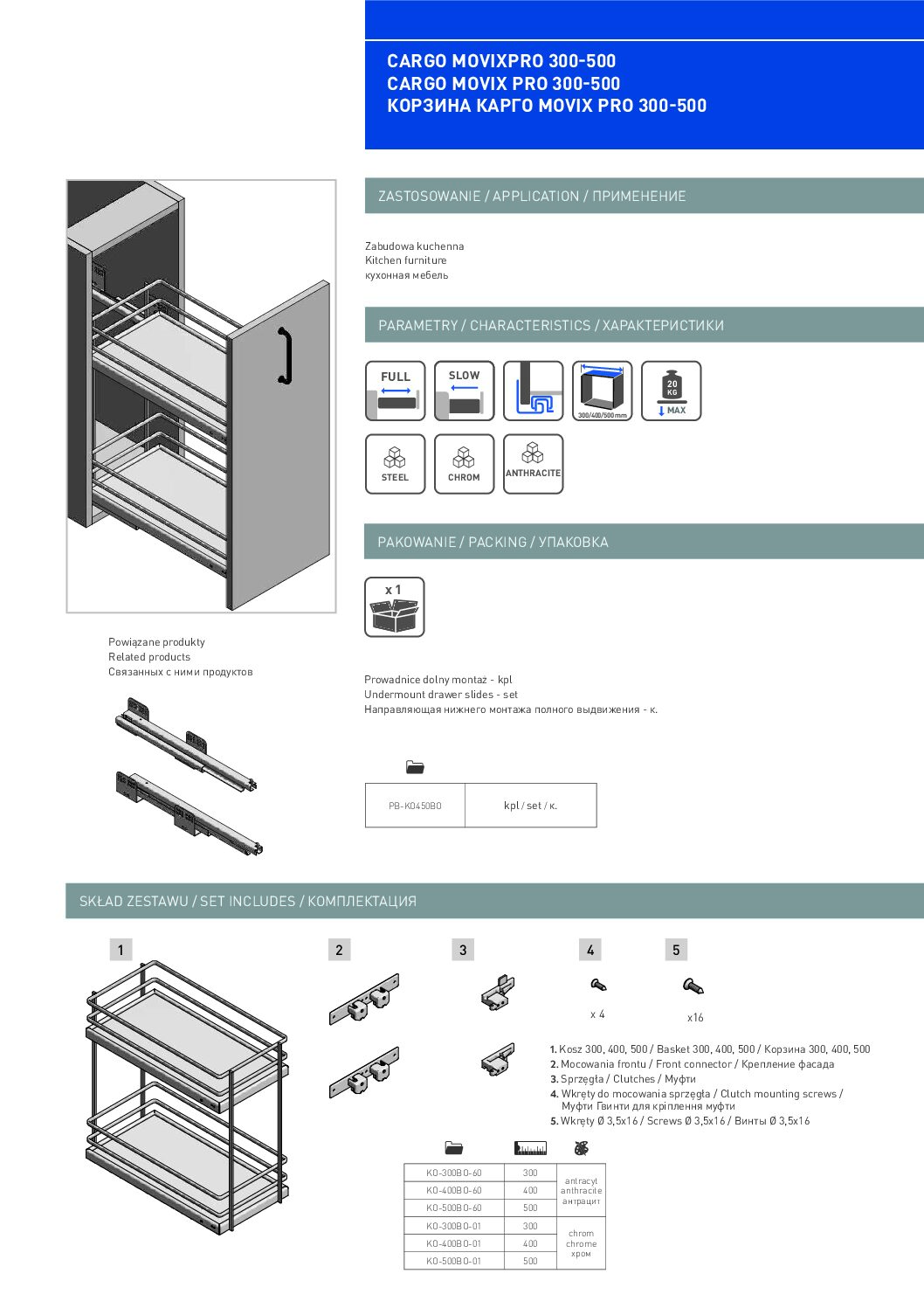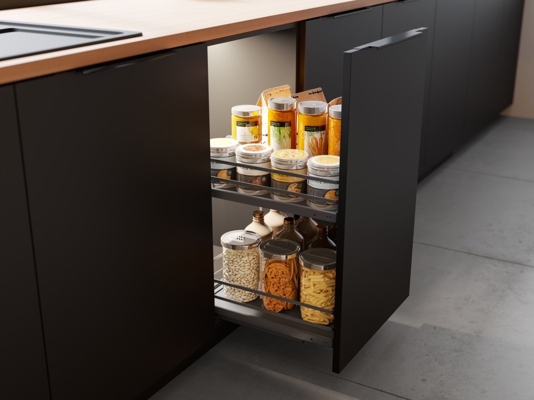 Карго GTV MOVIX Pro с плоским прутом - двухуровневая корзина, преимуществом которой является установка на направляющие скрытого монтажа полного выдвижения с доводчиком. Односторонний монтаж, с возможностью выбора левых либо правых направляющих, предусмотрен для карго шириной 150мм и 200мм. Для карго 300мм, 400мм, 500мм используются направляющие нижнего монтажа.