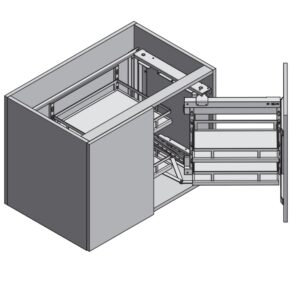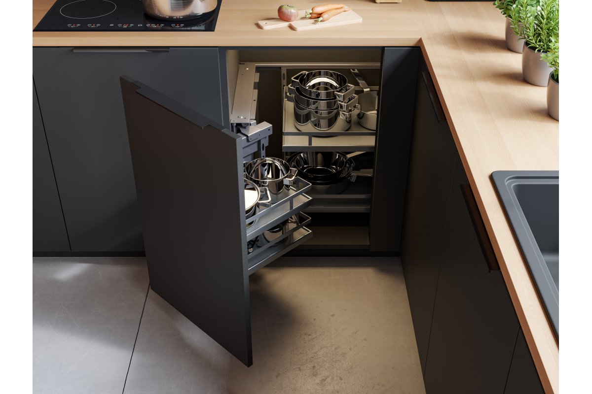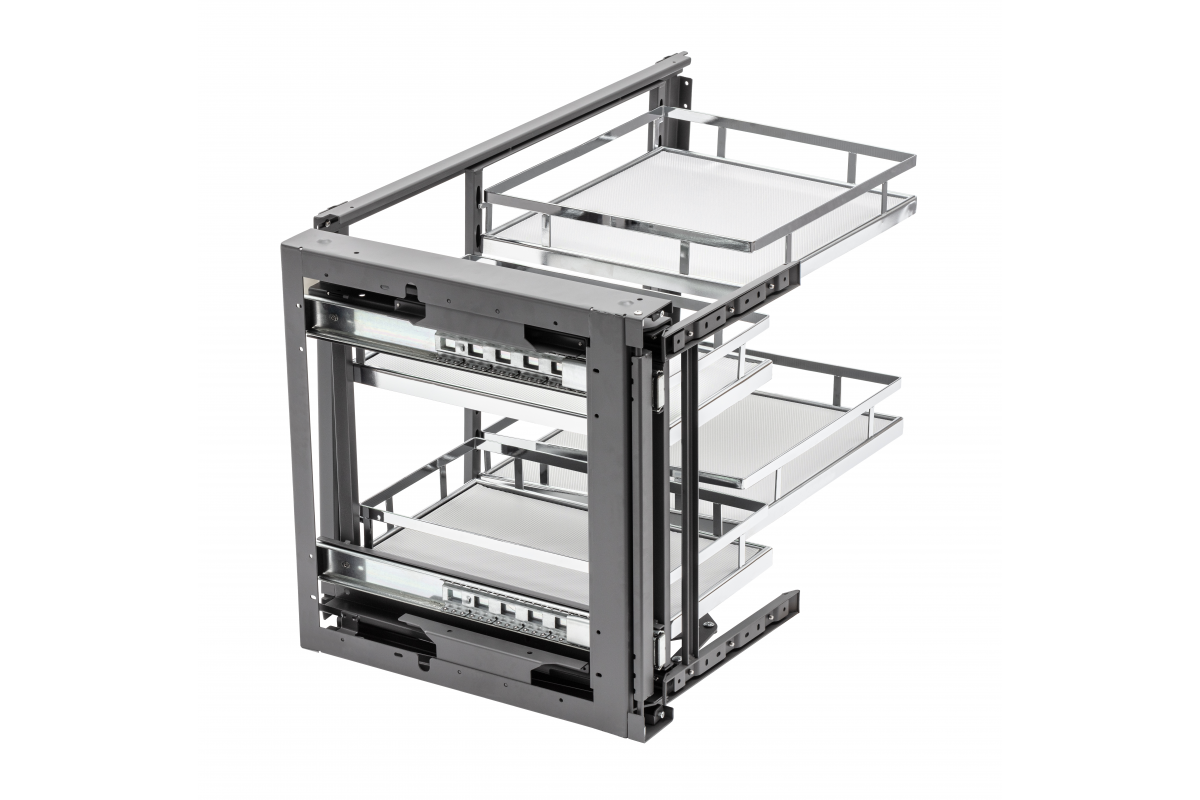 Волшебные уголки серии MOVIX PRO – это эргономичная система хранения для современной кухни. Они позволяют максимально оптимизировать труднодоступные места – т.е. кухонные уголки. Его можно использовать для хранения кастрюль, сковородок и бытовой техники. Выпускаются в двух цветовых вариантах: антрацит (серый коврик) и хром (серый или белый коврик).