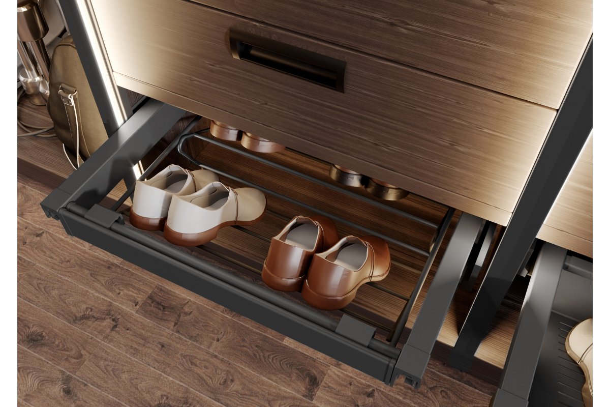 Полка для обуви ELITE - практичный элемент гардеробного наполнения, предназначенный для хранения обуви различного типа и быстрого доступа к ней. Полка крепится к боковинам шкафа. Ящик доступен в двух цветовых вариациях и четырех размерaх с возможностью регулировки ширины к корпусу