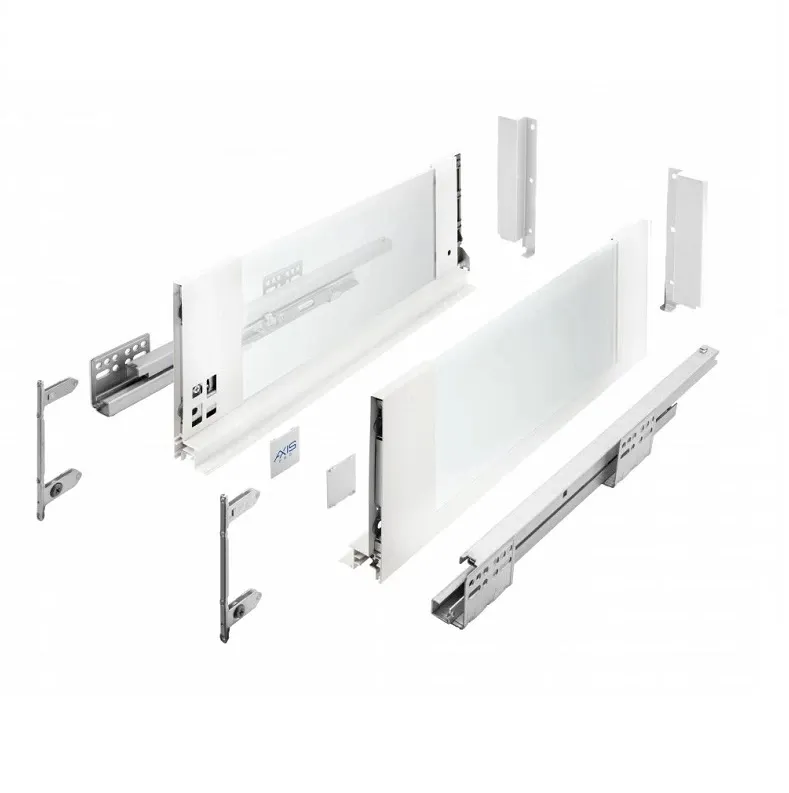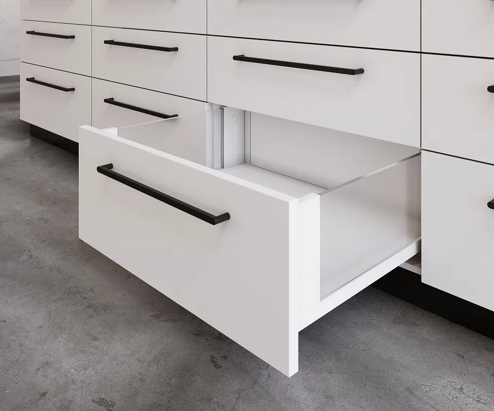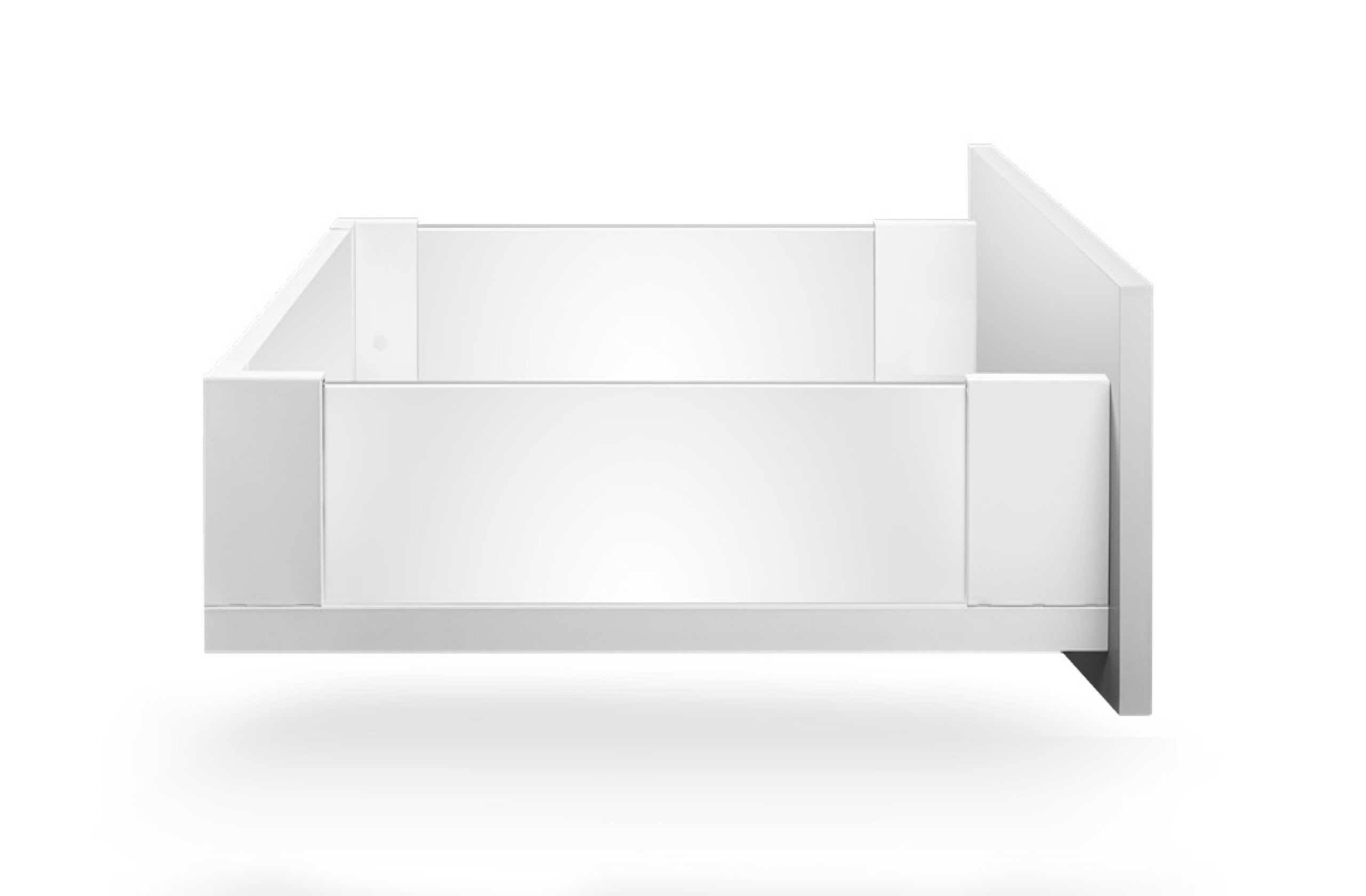 Ящик AXIS PRO GLASS с 3D регулировкой - это единственный ящик, который максимально использует пространство внутри,  что обеспечивается тонкой боковиной 13мм и нижним зазором всего в 22мм. Стеклянные боковины ящиков добавляют интерьеру необычную выразительность, конструкция воспринимается как еще более светлая и просторная.