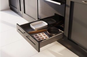 Удобный и практичный ящик Axis Pro высотой 69 мм под духовку для кухонных принадлежностей. Ящик AXIS PRO с 3D регулировкой, который максимально использует пространство внутри. Что обеспечивается тонкой боковиной 13мм и нижним зазором всего в 22мм.