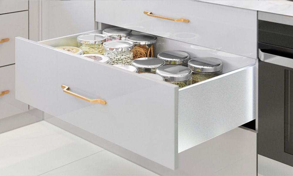 Ящик AXIS PRO push to open с 3D регулировкой - это единственный ящик, который максимально использует пространство внутри. Что обеспечивается тонкой боковиной 13мм и нижним зазором всего в 22мм.