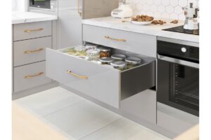 Ящик AXIS PRO push to open с 3D регулировкой - это единственный ящик, который максимально использует пространство внутри. Что обеспечивается тонкой боковиной 13мм и нижним зазором всего в 22мм.