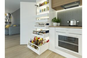 Ящик AXIS PRO push to open с 3D регулировкой - это единственный ящик, который максимально использует пространство внутри. Что обеспечивается тонкой боковиной 13мм и нижним зазором всего в 22мм.