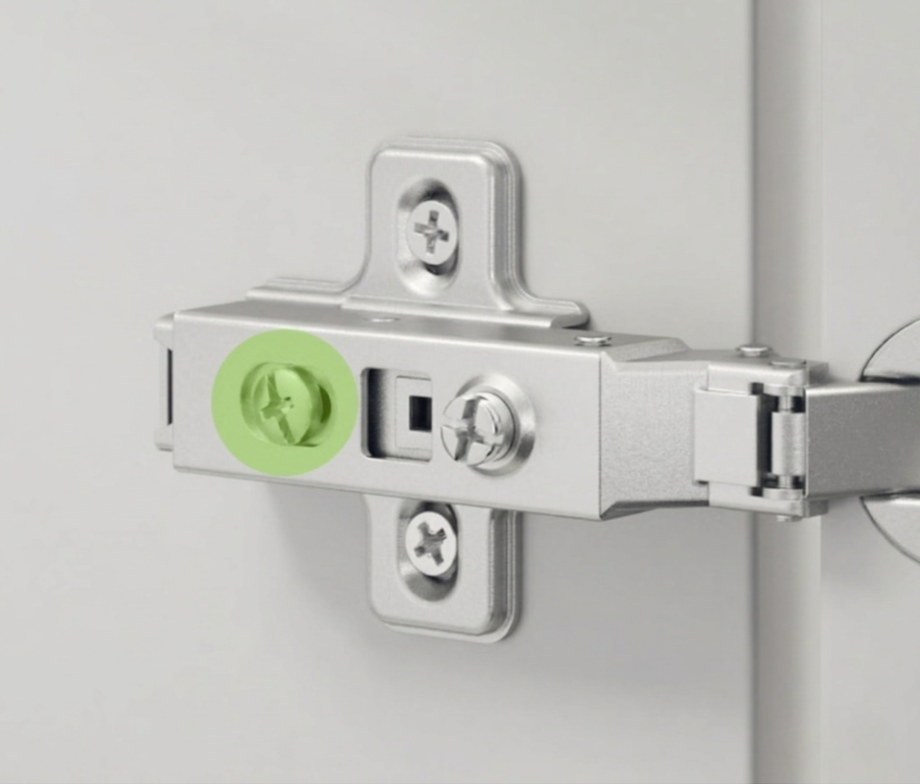 Крутите боковой винт, чтобы сместить фасад влево или вправо, пока расстояние между дверцами не станет одинаковым. Ориентир: ровные зазоры по всей высоте шкафа.