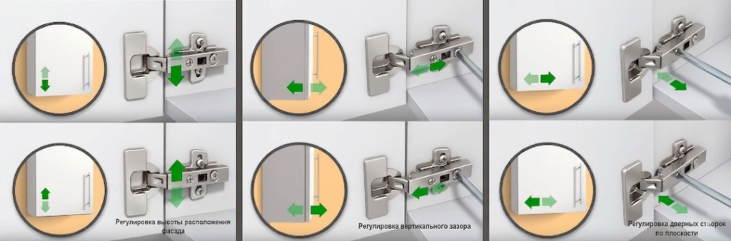 У стандартных мебельных петель есть три направления настройки: