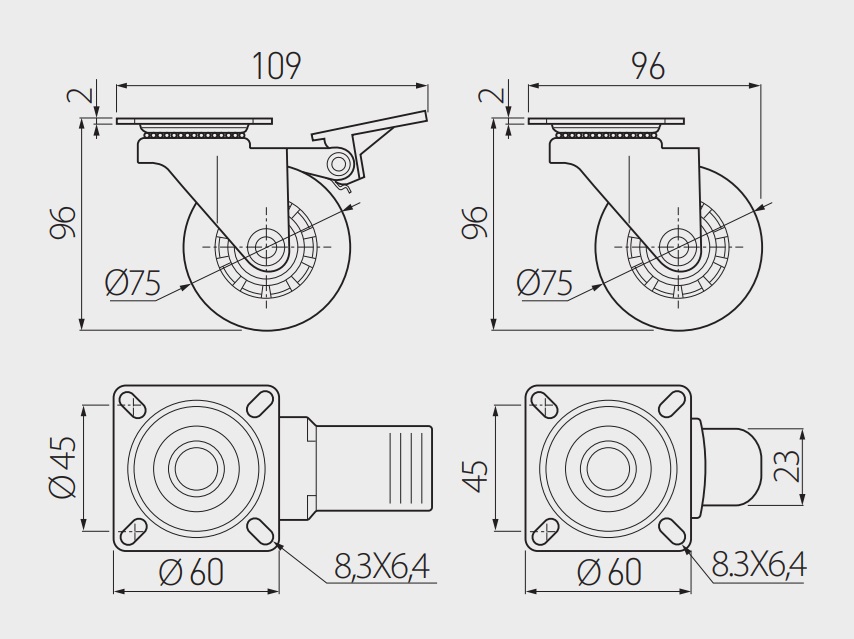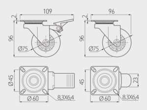 Колесо мебельное GTV BRAZYLIA представлено в трех размер: 35мм, 50мм, 75мм, а также в двух цветах: черный и прозрачный. При эксплуатация колеса предотвращают повреждение напольного покрытия.