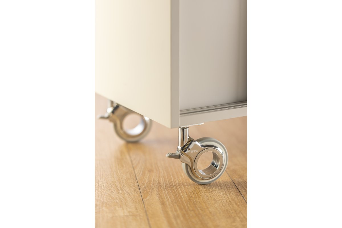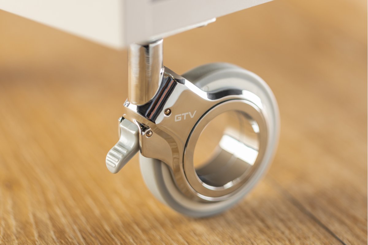 Колесо мебельное GTV GIRA представлено в двух размерах: 60мм и 75мм, а также в двух цветах: хром + черный и хром + серый матовый. Высота колес 94мм и 107мм соответственно. При эксплуатация колеса предотвращают повреждение напольного покрытия.