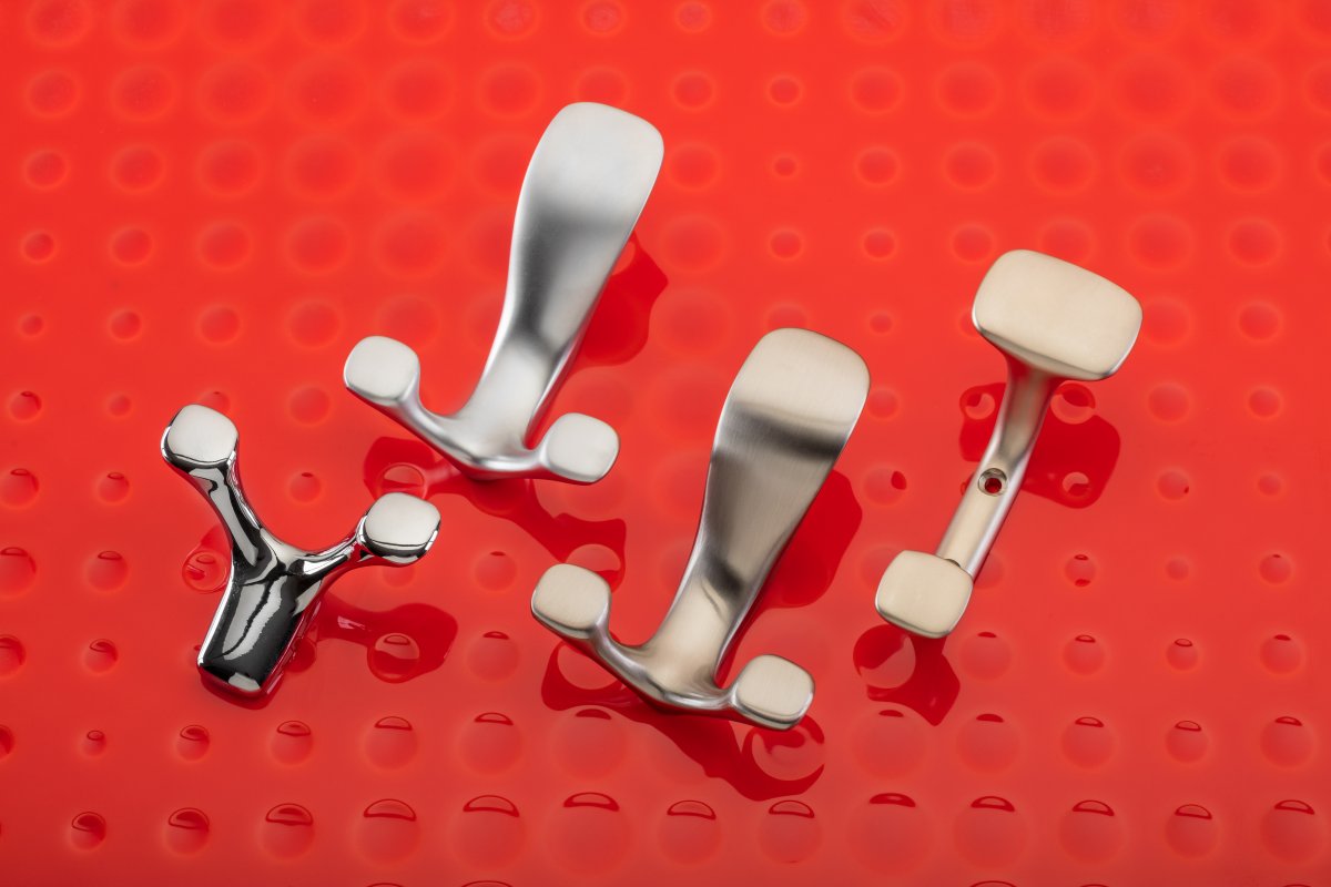 Крючок мебельный TOLEDO АO представлен в нескольких цветах: хром, сатин, алюминий, шлифованная сталь, черный матовый