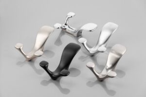 Крючок мебельный TOLEDO АO представлен в нескольких цветах: хром, сатин, алюминий, шлифованная сталь, черный матовый