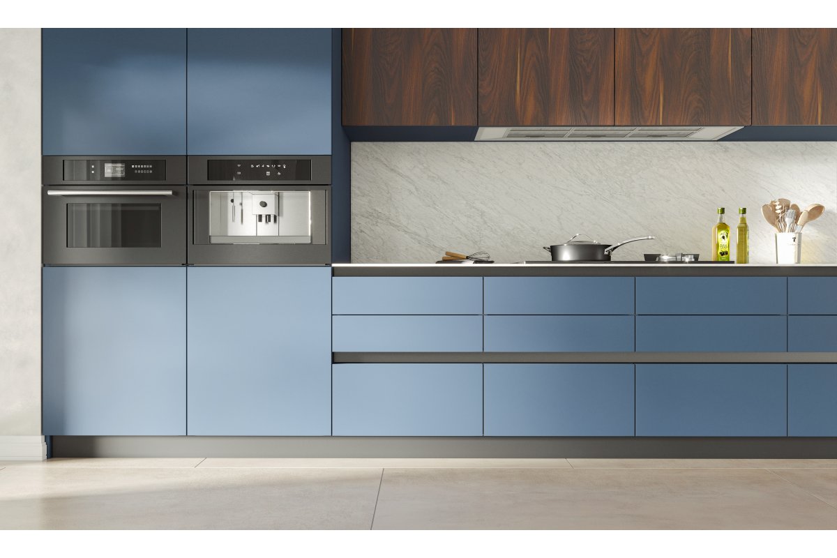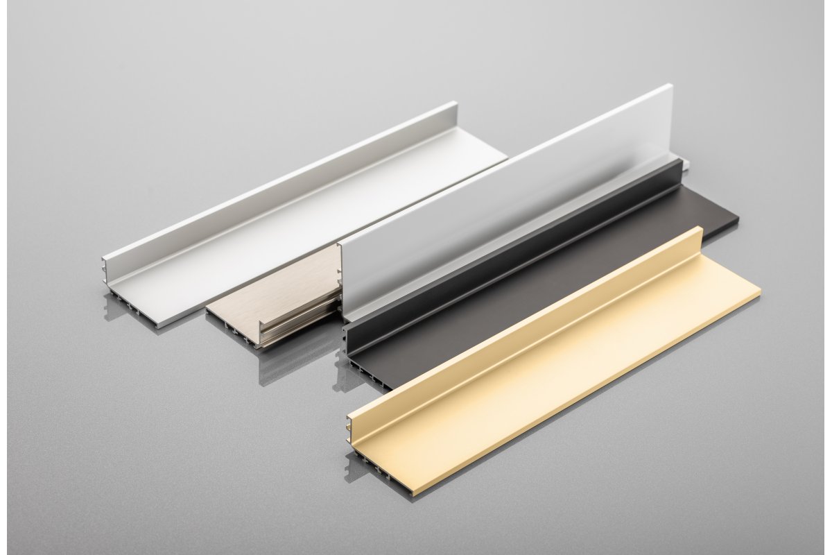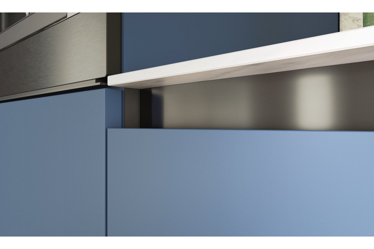 Горизонтальный L-профиль VELLO монтируется под столешницей. Его конструкция позволяет установить светодиодную ленту, чтобы освещать наполнение выдвижных ящиков верхнего уровня, располагающихся под L-профилем.