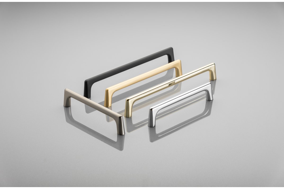 Ручка мебельная OCTAVIO доступна в пяти цветовых вариантах: хром, шлифованная сталь, шлифованное золото, латунь и черный матовый .