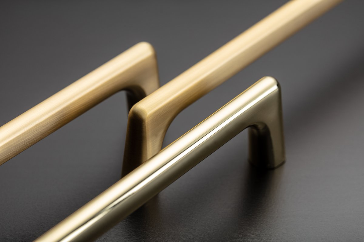 Ручка мебельная OCTAVIO доступна в пяти цветовых вариантах: хром, шлифованная сталь, шлифованное золото, латунь и черный матовый.