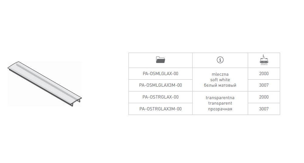 Экран для алюминиевых светодиодных профилей GLAX - это аксессуар, который используется для равномерного распределения светового потока, а также служит для защиты LED-ленты от механических воздействий и для дополнительного снятия излишнего тепловыделения, образующегося в результате функционирования светоизлучающих диодов. Доступен в двух размерах: 2000мм и 3000мм, а также в трех цветах: белый матовый, прозрачный и черный.